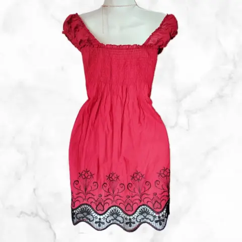 Vestido Rojo encaje negro. Vestido rojo hombros caídos Tiene encaje negro en la orilla y bordados de figuras Queda a tallas XS, S, M Medidas: 80 cm de largo Del pecho estira mucho