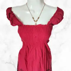 Vestido rojo hombros caídos Tiene encaje negro en la orilla y bordados de figuras Queda a tallas XS, S, M Medidas: 80 cm de largo Del pecho estira mucho