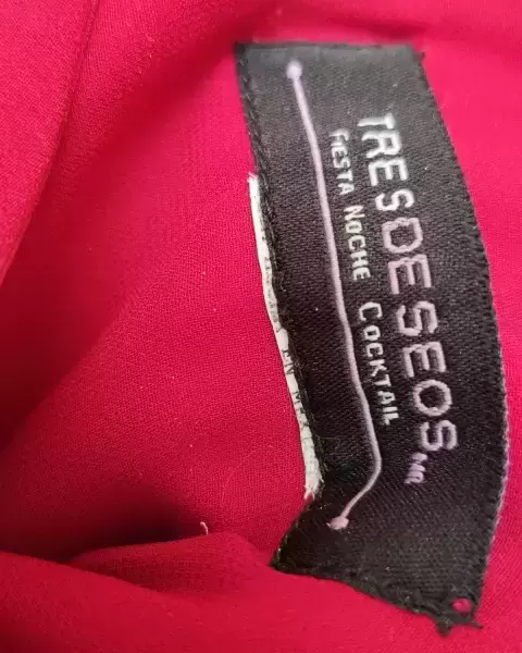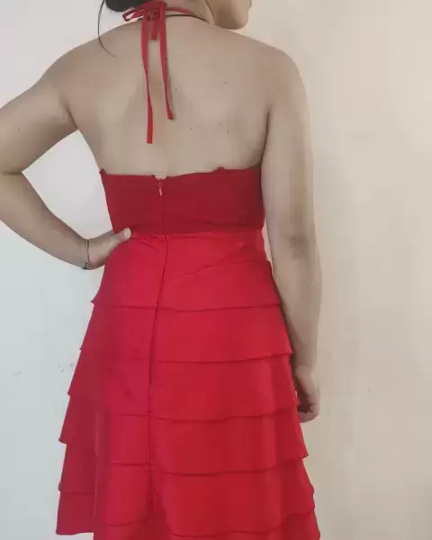 Vestido rojo de fiesta noche-cocktail marca Tres Deseos. Cierre en la parte de atrás, con cinta que se ata al cuello. Es talla 6 o S, pero yo soy S-M y me queda super bien. Las medidas de largo del cuello hacia abajo son 81 cm y de cintura 39. Tiene un detalle, una pequeñisima manchita en la parte de adentro que se muestra en la quinta foto. La manchita es imperceptible cuando se usa el vestido.