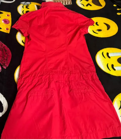 Vestido rojo corto, con botones para cerrar enfrente, ajustable en la cintura, bolsas enfrente, manga corta, Talla: Grande un poco reducido,de uso.
