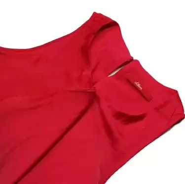Vestido rojo sin mangas con volado al frente desde el cuello hasta abajo. Tiene cuello redondo, trae forro, vestido tipo A, excelente para primavera verano.