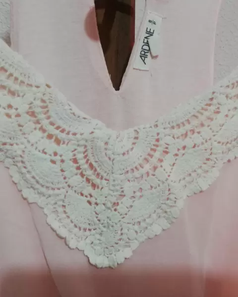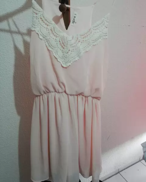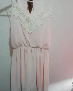 Vestido rosa. Vestido corto de gaza con forro super o modo con adorno tejido al cuello