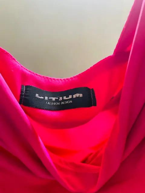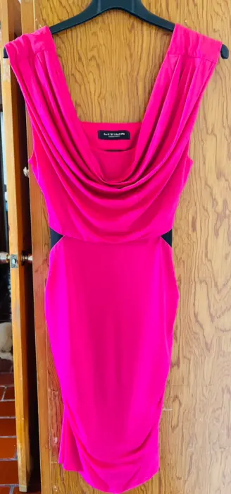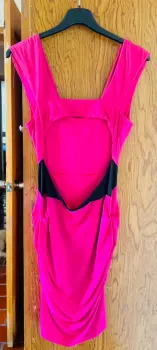 Vestido rosa Barbie. Vestido color Roa Barbie, corto con escote en la espalda. Detalles decorativos en negro.