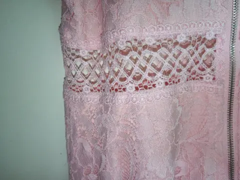 Vestido color rosa corto con encaje de flores del mismo color cierren buenas condiciones color plata en la parte posterior sin mangas y cuenta con una apertura en la parte media