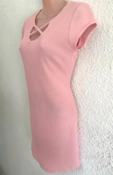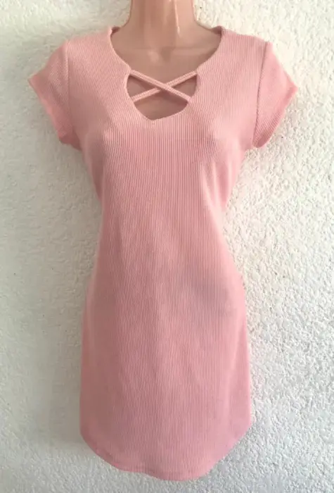 Vestido rosa cuello V tela un poco ajustable. Vestido rosa se ajusta al cuerpo, con tela con rayas resaltadas 2 tiras en cuello en V con manga corta, queda a talla S o XS, queda arriba de la rodilla, si necesitan medidas las proporciono con gusto, excelente para la temporada