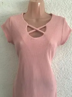 Vestido rosa se ajusta al cuerpo, con tela con rayas resaltadas 2 tiras en cuello en V con manga corta, queda a talla S o XS, queda arriba de la rodilla, si necesitan medidas las proporciono con gusto, excelente para la temporada