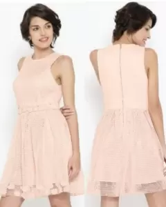 Vestido rosa encaje. Hermoso vestido de encaje tipo red color rosa con flores con perlas mismo que el de fotos de referencia no cuenta con etiquetas de marca y talla pero da sin problems talla ch-m con forro estira levemente MEDIDAS ziza a ziza 42cm cintura 35cm largo del hombro hacia abajo 87cm