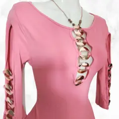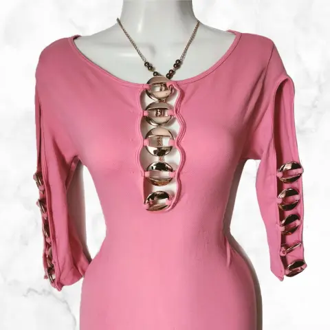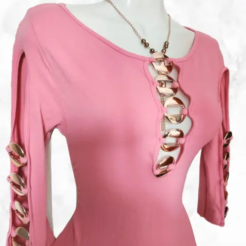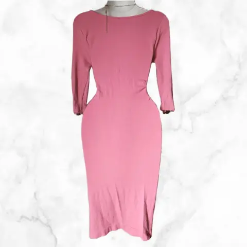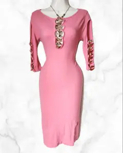 Vestido Rosa pastel pegadito. Vestido Rosa pastel Con escote y mangas con accesorio de figura Tela tipo licra Unitalla Medidas 100 cm de largo 35 cm de axi-axi (estira mucho más hasta 50 cm) Manga 3/4 de 40 cm de largo Abertura de escote 20 cm