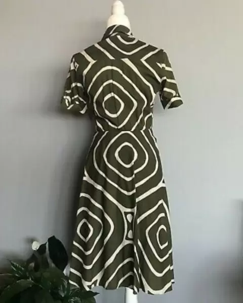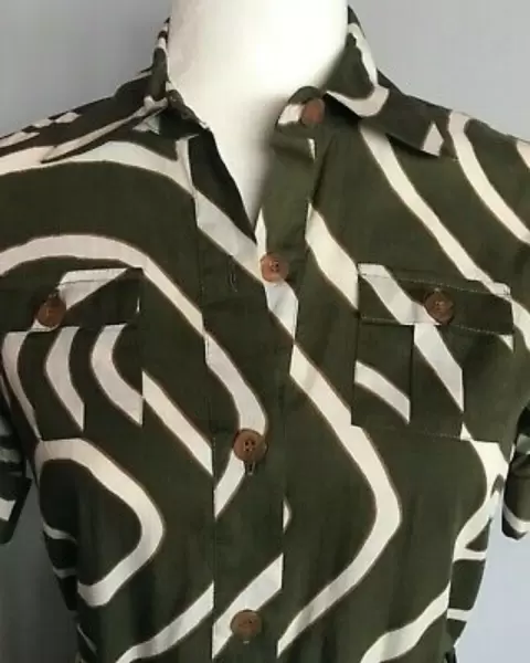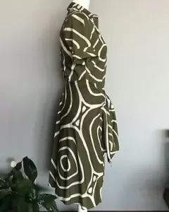 Hermoso vestido estampado safari nvo, de la diseñora diane con furstemberger talla 2, con botones al frente, manga corta, con dos cortes de tela que se abrochan a la cintura, dos bolsillos en el pecho.