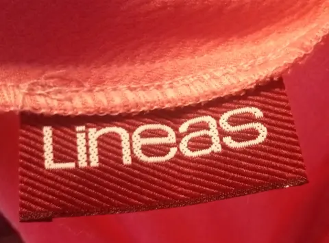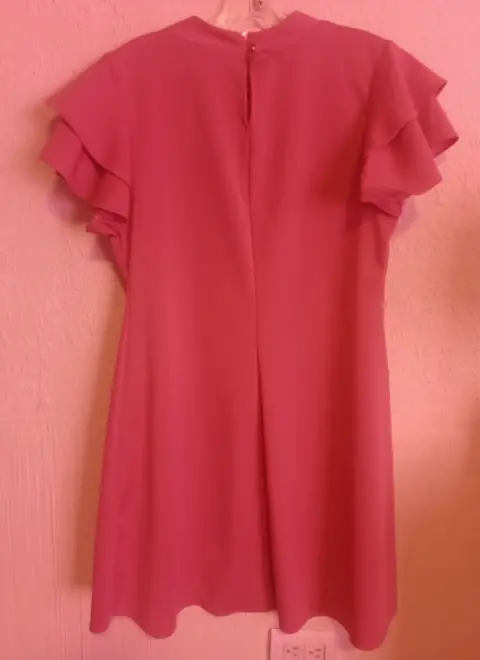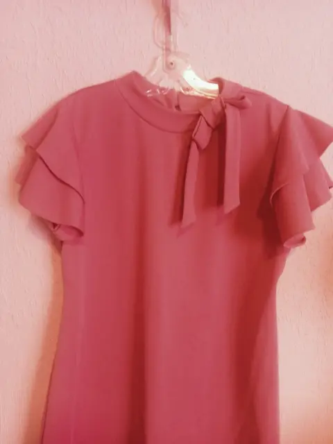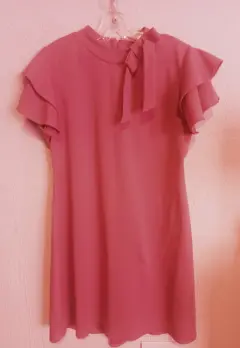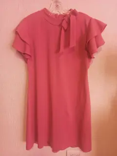 Es un vestido corto, color salmón, manga corta con olanes. Tiene un moño en el cuello, es de corte A.