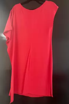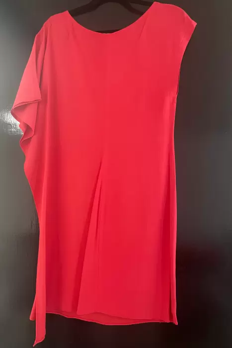 Vestido Salmón con manga asimétrica. El vestido es suelto tiene una manga corta y otra manga estilo murciélago, el color luce mucho. No tiene ningún detalle. No tiene forro pero la tela no se transparenta nada. 99% Viscosa1% elastano