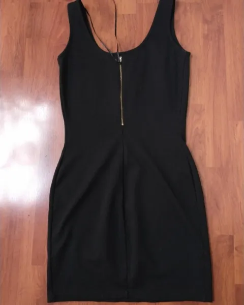 Vestido negro, sin manga, super strech, cierre en espalda, queda arriba de la rodilla, talla M, un par de puestas, en perfecto estado. No decolorado, Color impecable.