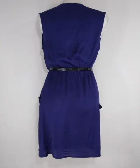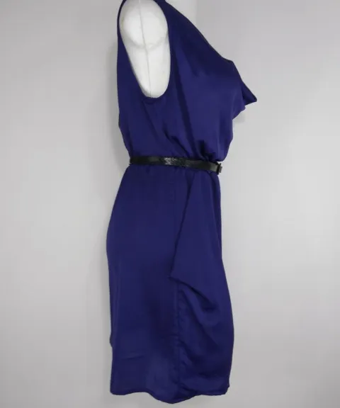 Vestido satinado escote fluido. 86 Vestido satinado escote fluido con mangas sisa. Elástico en cintura y bolsillos laterales. Color Azul. Composición: 100% Polyester. Medidas: Busto 49 - Cintura 36 - Largo 87 cm. Sin detalles, esta en perfecto estado. No incluye cinturón.