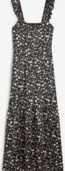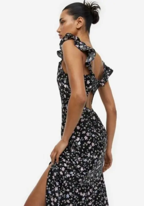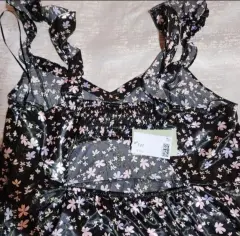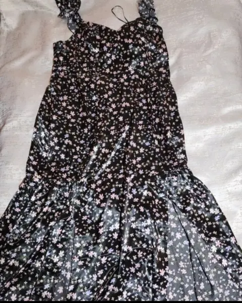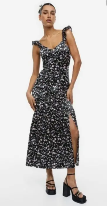 Vestido satinado negro con estampado de flores marca H&M. Super fresco, con dos aberturas al frente. Elástico y abertura en la espalda y tirantes tipo olanes. Completamente nuevo. Con etiqueta.Medidas: axila 58cms, cintura 50cms, cadera 60cms.Bellísimo!! 🖤🖤🖤