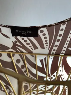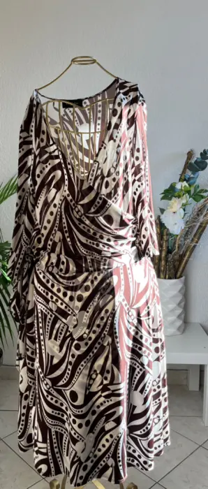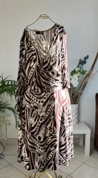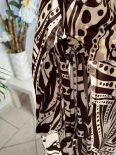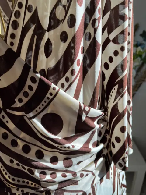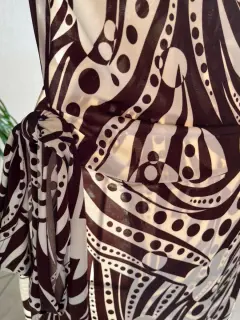 Vestido semi envolvente Rue de la Paix talla Grande, beige con café.Manga 3/4 con cintas de la misma tela del vestido que hacen un moño llamativo a un costado, en la parte del escote tiene un plizado que lo hace muy elegante.La tela es líkra con Spandex, la tela es semi delgada.Tiene el desgaste de algo usado