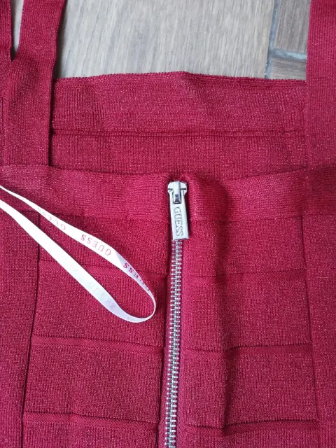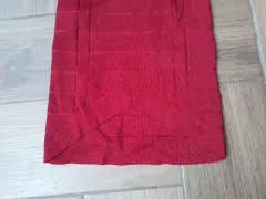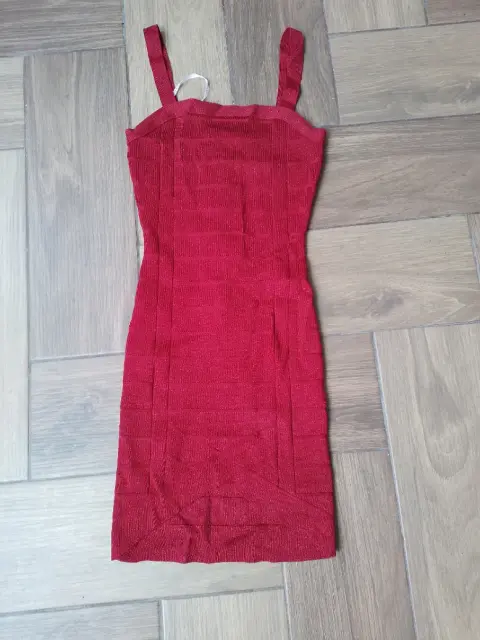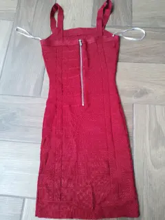 Vestido sensual. Vestido corto de tela amoldable al cuepo , gruesa color rojo brillante . En la parte frontal termina en triángulo