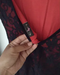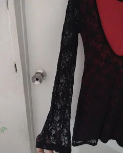 Hermoso vestido de la marca Viky forma muy sexi en la parte de atrás trae un escote que asé que buscas tu espalda es corto a las rodillas con transferencia en las mangas largas trae una tela transparente arriba y por la parte de abajo un forro en color rojo que lo asé ver sexi y atrevido está lindísimo para usar en cualquier momento.
