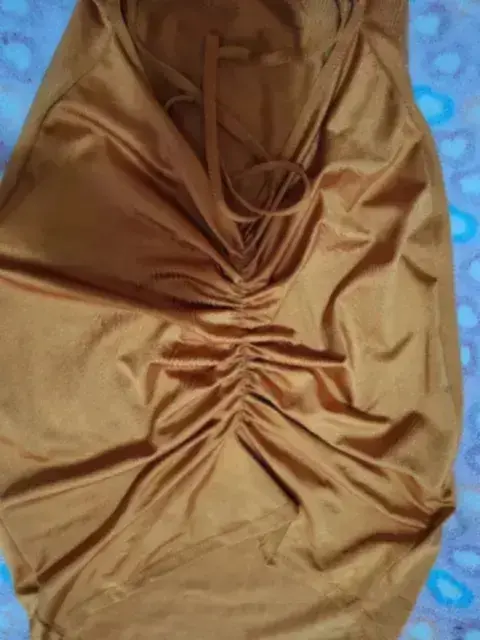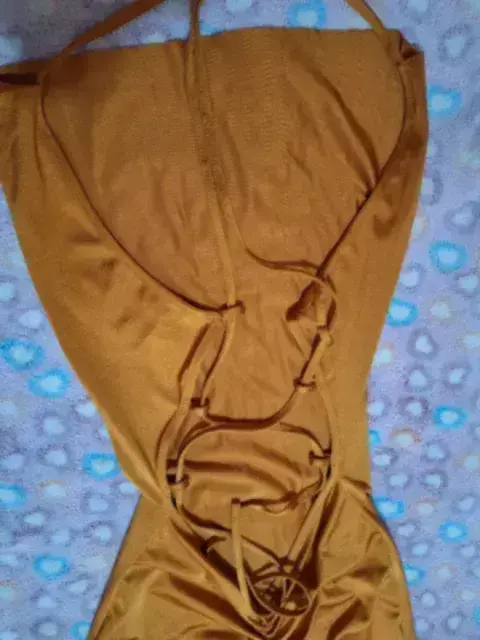 Vestido sexy satinado. Hermoso vestido corto, sexy, fresco y casual color es amarillo dorado vivo. En la espalda trae unas cintas que lo hacen ver muy sexy y resorte en la parte de atrás de las pompas que hacen que resalte tu figura