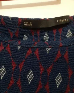 Vestido Sfera. Lindo vestido corto azul marino, con begoña y blanco. Tiene un pliegue en el frente. Usado, pero en buen estado. Talla S. Medidas:hombro a hombro:36 cm, axila a axila: 41 cm y largo de 80 cm.