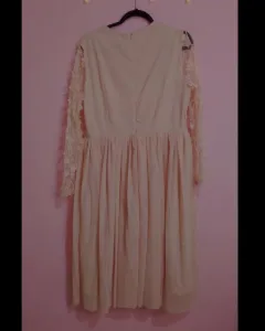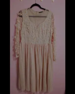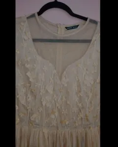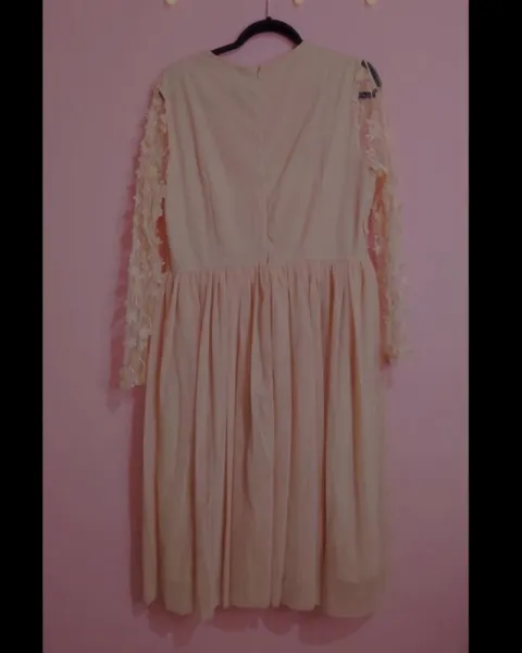 Vestido con florecitas en la parte de arriba en color entre melón y rosa. Está súper hermoso en la parte de arriba tiene como brillito en el contorno de las florecitas.