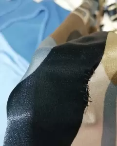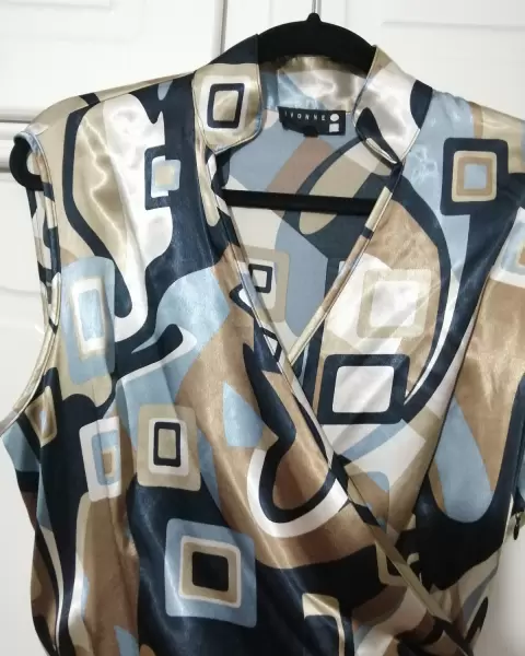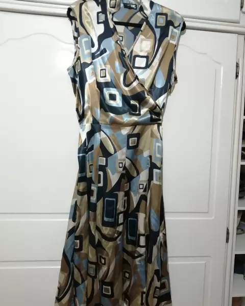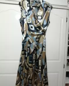 Lindo Vestido de poliester y Poco elástico de varios colores cruzado de la parte frontal y negro cierre oculto en la parte lateral se abrocha con moño en la parte trasera, en la parte de la falda tiene un pequeño jalón remendado y que no se percibe gracias a los decorados de la tela color negro dorado y beige