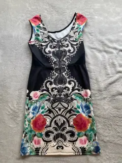 Vestido sin mangas. Vestido ajustado y estampado sin mangas con transparencia en cintura y cierre en la espalda