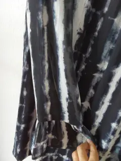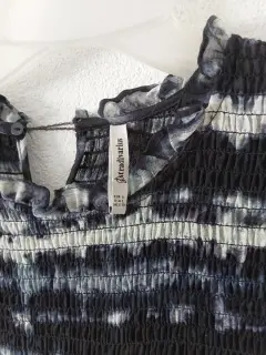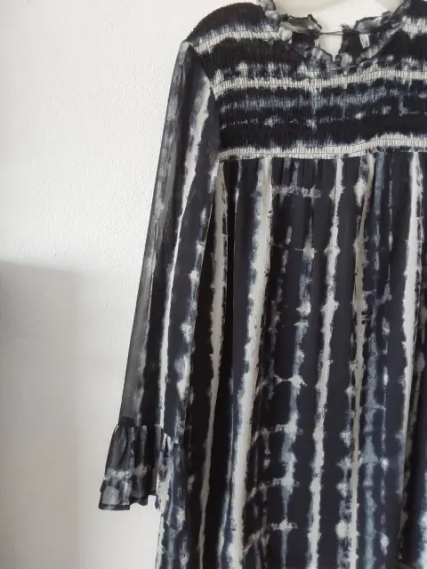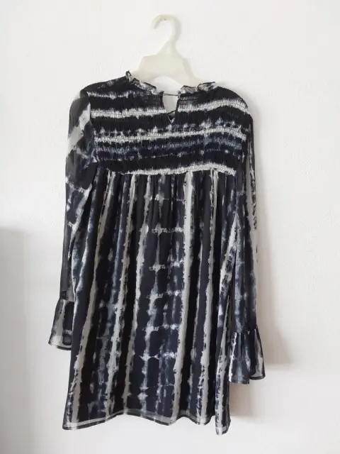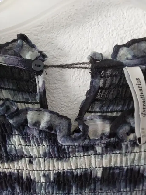 Vestido stradivarius blanco con negro. Vestido de gasa con fondo, no se transparenta. Manga con olan. Vestido en linea A. Tiene un poco descocido el botón. Se muestra en la foto