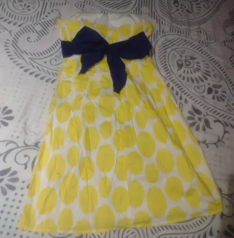 Vestido straple amarillo ,con fajilla para moño azul marino muy bonito para cualquier ocasión