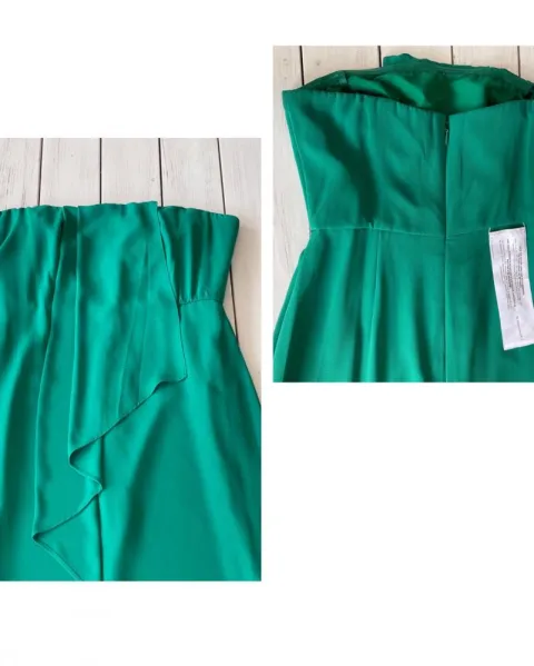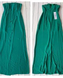Talla: 2, ultra green (verde esmeralda) , strapless, corsé integrado, forro hasta arriba de la rodilla, tiene un olán al frente, abertura de la pierna. Se envía con el cubre de la marca. Medidas: 37.5 cm de axila, 33 cm abajo del corsé, 47 cm de cadera y 1.29 mt de largo.