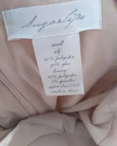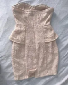 Hermoso vestido strapless con estoperoles alrededor del busto y olán altura de la cintura, tela gruesa súper elegante talla chica, trae banda adherible a la altura de las copas para que no resbale!!Es color nude.