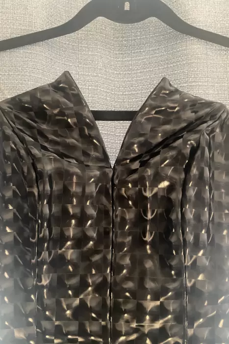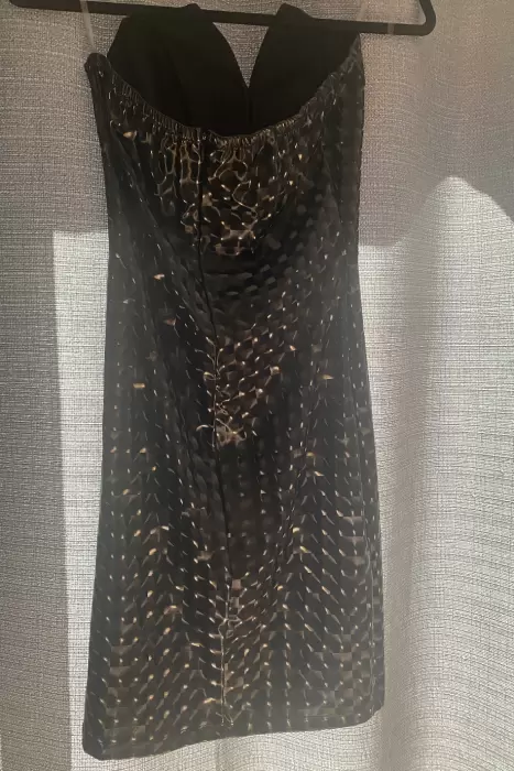 Vestido Strapless con cuello en V, la V tiene varillas de metal para mantener la forma, el vestido es Stretch y la tela es muy suave, no se transparenta nada, es negro y la tela tiene un efecto óptico como de disco de Vinilo, brilla muy padre sobre todo de noche y tiene resorte en la espalda para tener un mejor fit. El único detalle es que le falta una de las tiritas transparentes de los lados que se usan para colgar los vestidos.