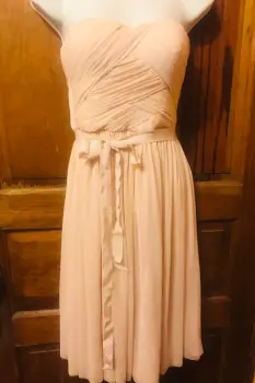 Vestido strapless corto rosa palo, para fiesta. Con cinturón de tela. Tela estilo chifón o vaporosa pero es poliéster con nylon. Talla 2 o extra extra chica. Tiene solo una puesta pero como es delicado, se jalo un poco de una parte y aunque no es muy notorio me pareció importante mencionarlo, adjunto la imagen.