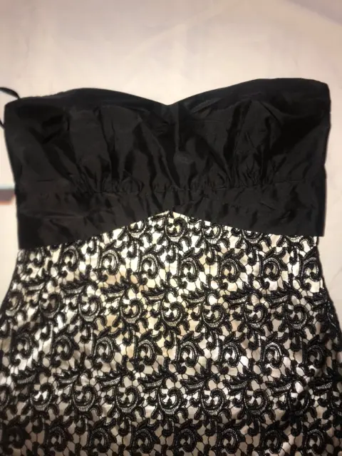VESTIDO DE CÓCTEL STRAPLESS, TALLA 4, FONDO BEIGE, ENCAJE NEGRO. SEMI NUEVO.