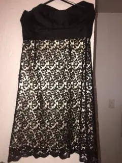 VESTIDO STRAPLESS DE CÓCTEL. VESTIDO DE CÓCTEL STRAPLESS, TALLA 4, FONDO BEIGE, ENCAJE NEGRO. SEMI NUEVO.