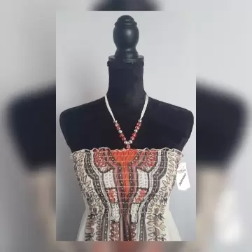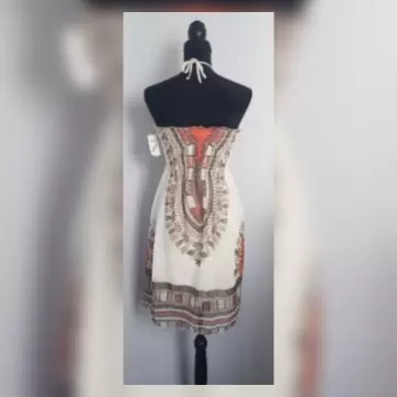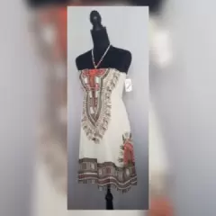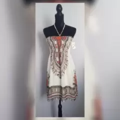 Vestido strapless estilo boho c/cinta mismo tejido y aplique bisutería, color base MARFIL c/estampado tonos TIERRA, elástico en torax para mejor ajuste y forro interior. UNITALLA (da a S/M). Dimensiones cms: 25.5 (da hasta 42.5) axila, 31.5 (da hasta 48) cintura, 17.5 largo torso, 58.5 largo faldón, 76 largo total. 100% poliéster. P/lavado en casa.***PUEDE USARSE COMO BLUSÓN TAMBIÉN***