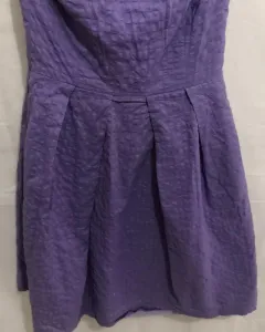 Vestido strapless morado marca J.Crew con cierre trasero y pegamento en el pecho para ajuste perfecto, bolsillos laterales Y varillas en el pecho amolde perfecto.