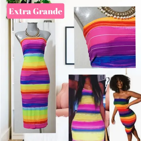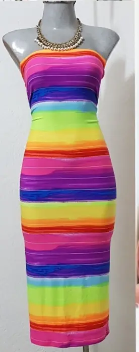 Vestido strapless multicolor. Hermoso vestido straples, super strech. Colores vivos, se amolda al cuerpo. Resorte en busto. Largo midi (bajo rodilla)