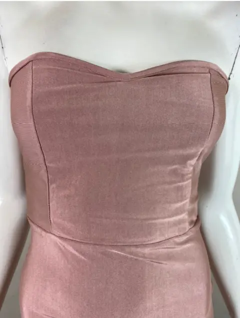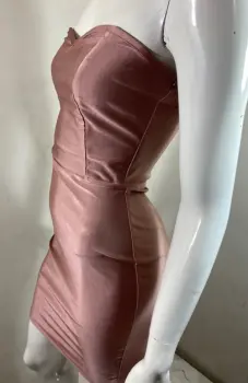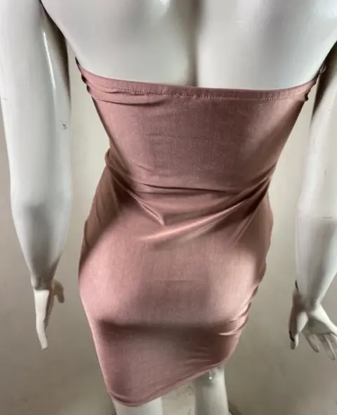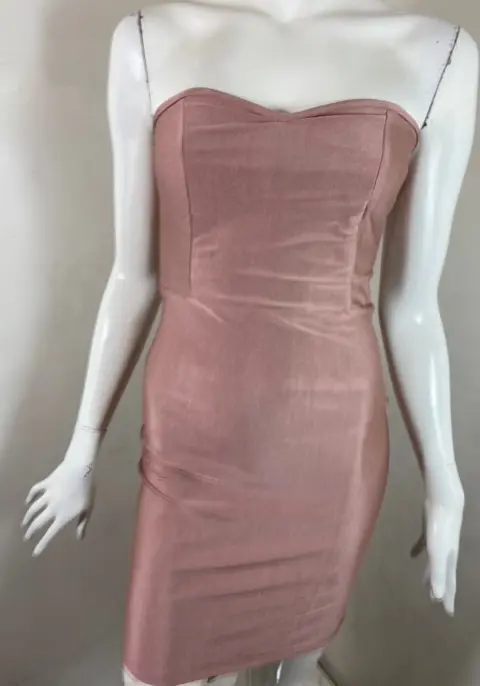 Vestido strapless en tono nude en licra satinada muy elástica en licra satinada, es recto y corto en talla única que llega a chico y mediano