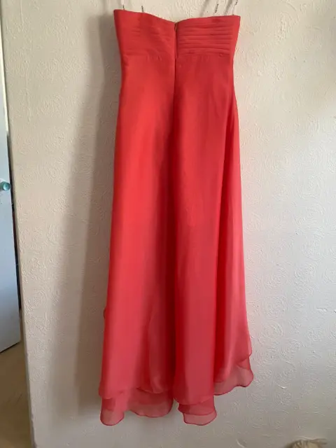 Vestido strapless salmón. Talla 5 (chica), color salmón, corto de enfrente, largo de atrás, con cierre en la espalda.