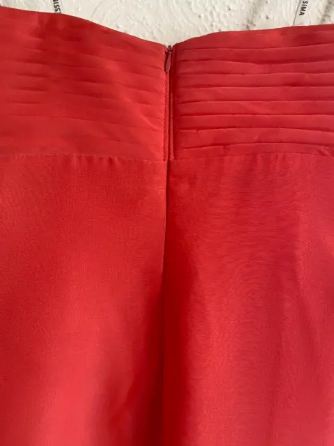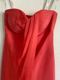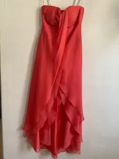 Talla 5 (chica), color salmón, corto de enfrente, largo de atrás, con cierre en la espalda.