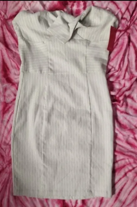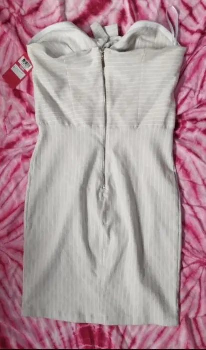 Vestido Strapless strech. Este padrísimo vestido te hará lucir sensacional en cualquier evento. Ideal para alguna comida, bautizo o cualquier evento social. Lo puedes utilizar en forma casual con unas lindas sandalias o zapatillas. El color es beige muy claro con rayas muy finas en color blanco. Al frente tiene un moño a la altura del pecho. Cuenta con cierre trasero. Tela stretch. Etiquetado en $999.Viene a la talla.