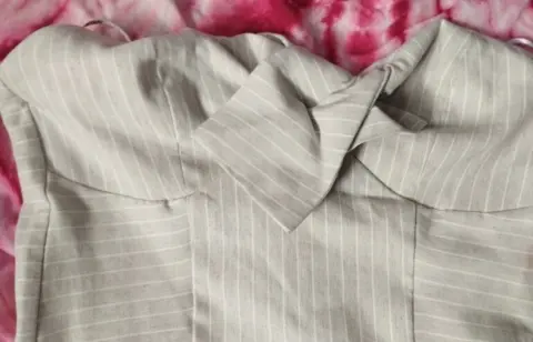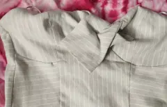 Este padrísimo vestido te hará lucir sensacional en cualquier evento. Ideal para alguna comida, bautizo o cualquier evento social. Lo puedes utilizar en forma casual con unas lindas sandalias o zapatillas. El color es beige muy claro con rayas muy finas en color blanco. Al frente tiene un moño a la altura del pecho. Cuenta con cierre trasero. Tela stretch. Etiquetado en $999.Viene a la talla.