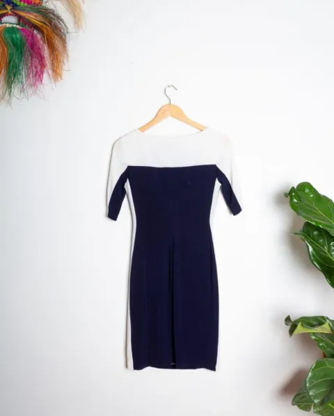 Vestido tela tipo strech, azul marino con blanco, ajusta muy lindo y da de si la tela sin problema.