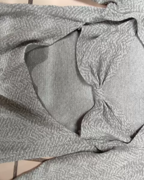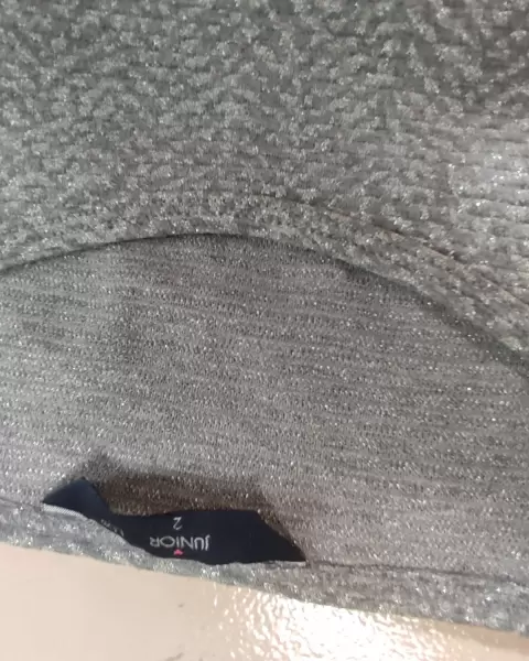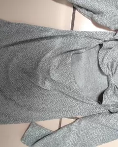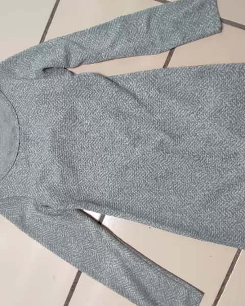 Vestido sueter gris brillosito talla 2 Lob. Vestido de tela de sueter, ideal para el otoño e invierno, con mallas o botas, tiene abertura en la espalda y un moño en la parte de atras, manga larga, es corto, talla 2, osea mediano, la composicion es 92% poliester y 8%algodon.