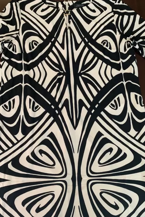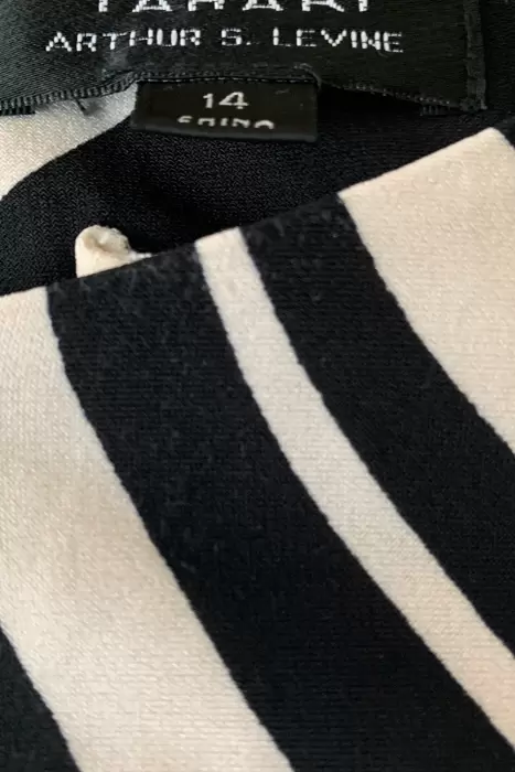 Vestido Tahari 14. Vestido escote redondo con detalle en metal, crema y negro. Vestido 100% forrado de poliéster. 93cm largo, 44cm hombro y 43cm manga. Excelente estado de uso.
