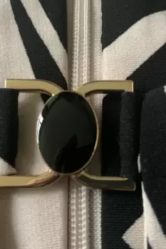 Vestido escote redondo con detalle en metal, crema y negro. Vestido 100% forrado de poliéster. 93cm largo, 44cm hombro y 43cm manga. Excelente estado de uso.