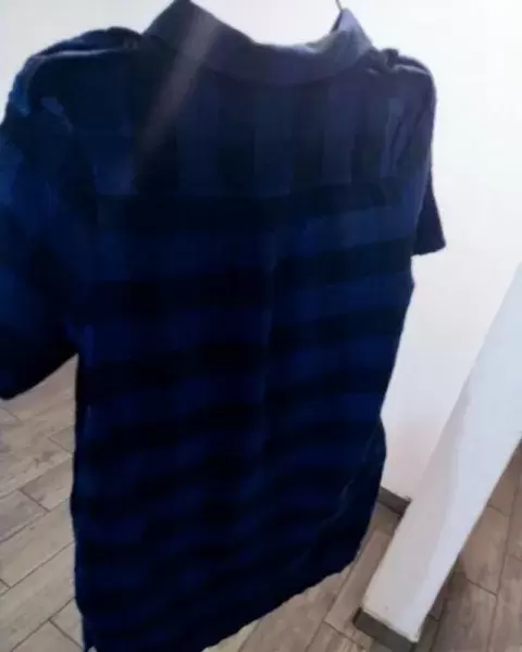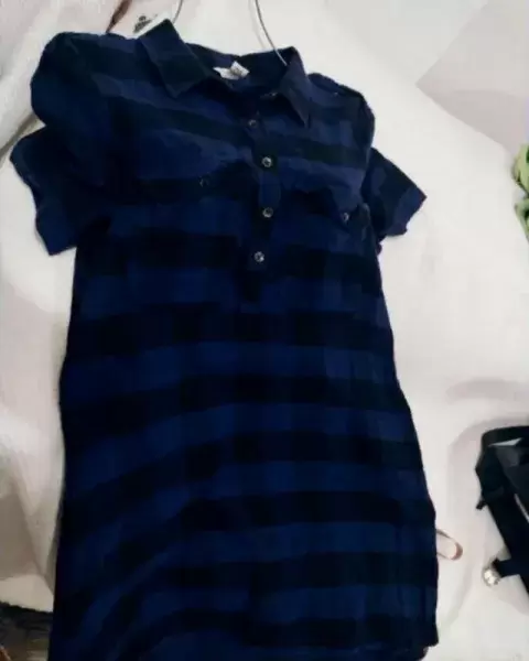 Vestido de manga corta juvenil en talla L de manga corta azul con negro sus medidas de hombro a hombro 40cm, axila a axila 52cm, cintura 51cm, largo total 88cm..
