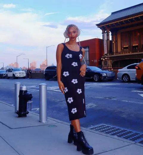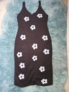 Vestido a media pierna en tejido jacquard suave con escote pronunciado al frente y en la espalda. Modelo sin mangas con aberturas en los laterales de la bastilla.Tiene forma . Es L pero da hasta xlAberturas a los ladosLas flores son lilas.Tenía un descocido de unos 3 cm el cual ya se arreglo. No afecta el uso ni se nota .
