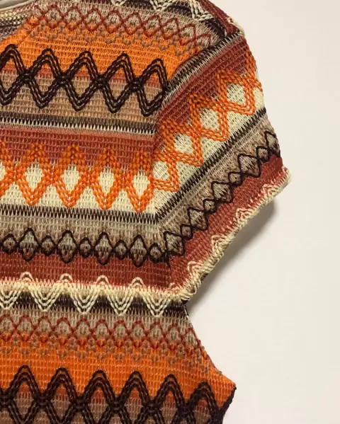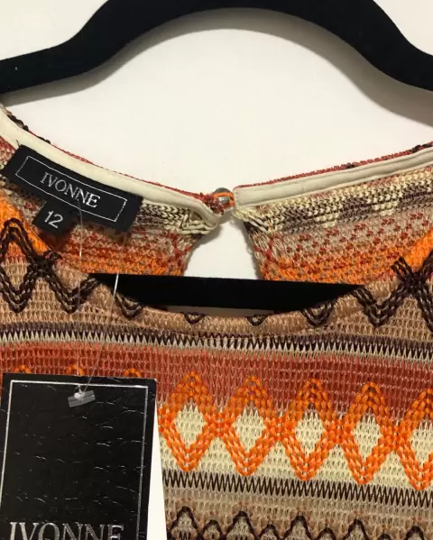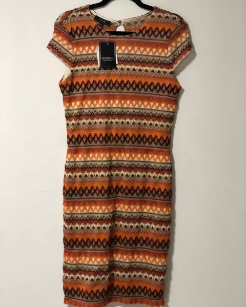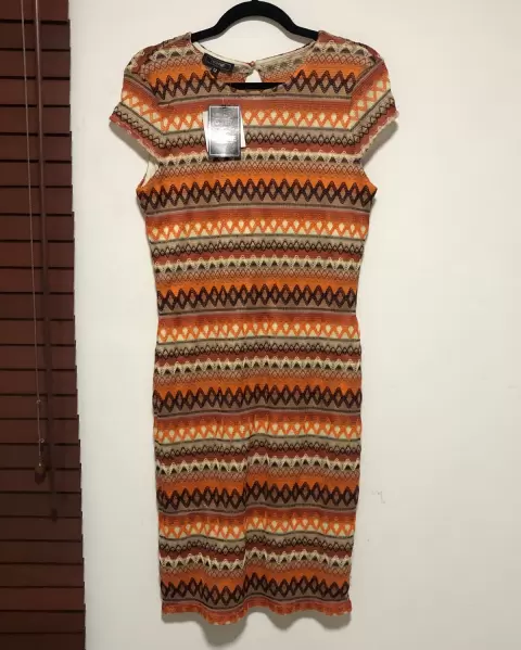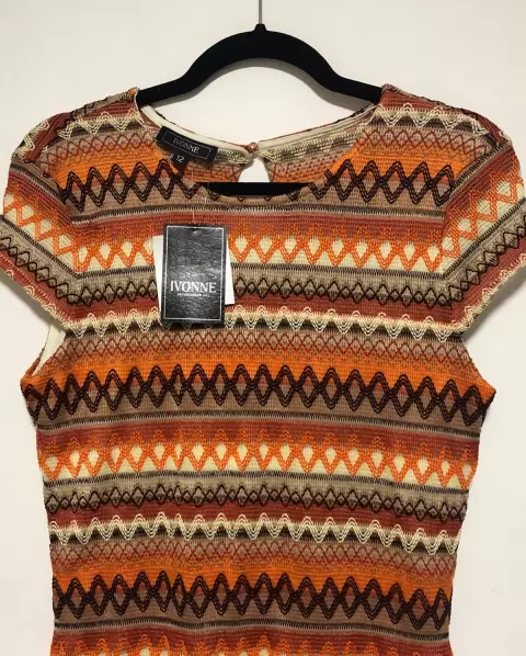 Vestido tejido multirayasMarca Ivonne97% poliéster, 3% elastano La etiqueta dice talla 12, creo que le queda a M o G
