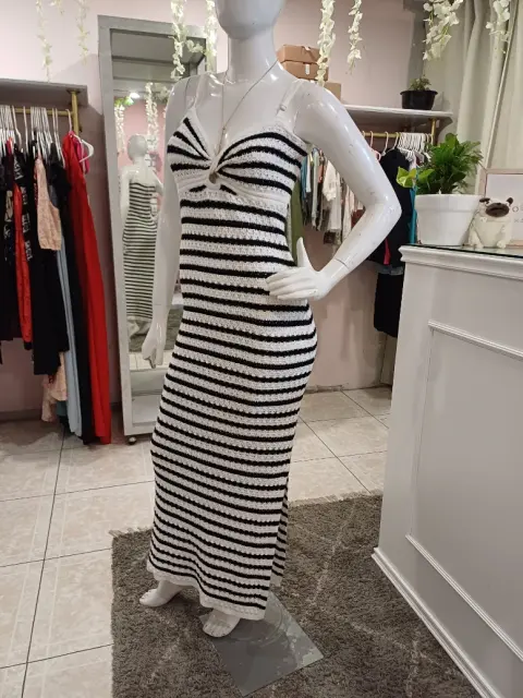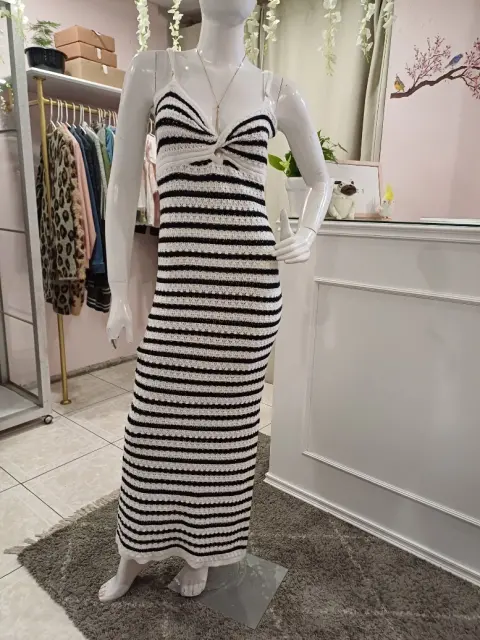 🤍Hermoso vestido tejido largo , con rayas negras y blancas. Los tirantes son ajustables. Tiene abertura en pierna izquierda🌸El vestido se ajusta al cuerpo y estira🍂Las medidas son ax a ax 39 CM, cintura 32 CM, largo 152 CM.